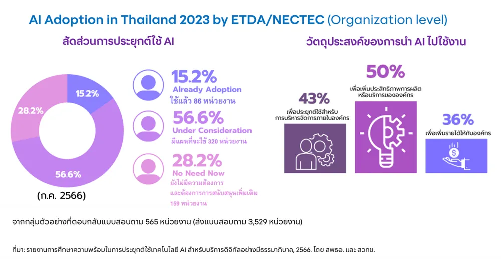- ดร.ศักดิ์ เผยผลการสำรวจที่พบว่า ประเทศไทยให้ความสำคัญกับการพัฒนา AI เป็นอันดับที่ 37 ซึ่งถือว่าสูงทีเดียว แต่ในเชิงการนำ AI ไปใช้งานจริงกลับพบว่า มีเพียง 86 หน่วยงานในประเทศ คิดเป็น 15.2% ที่ใช้งานอย่างจริงจัง ซึ่งถือว่าค่อนข้างน้อย